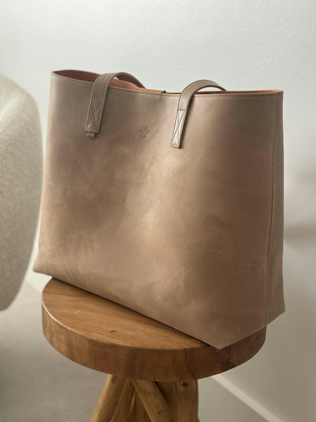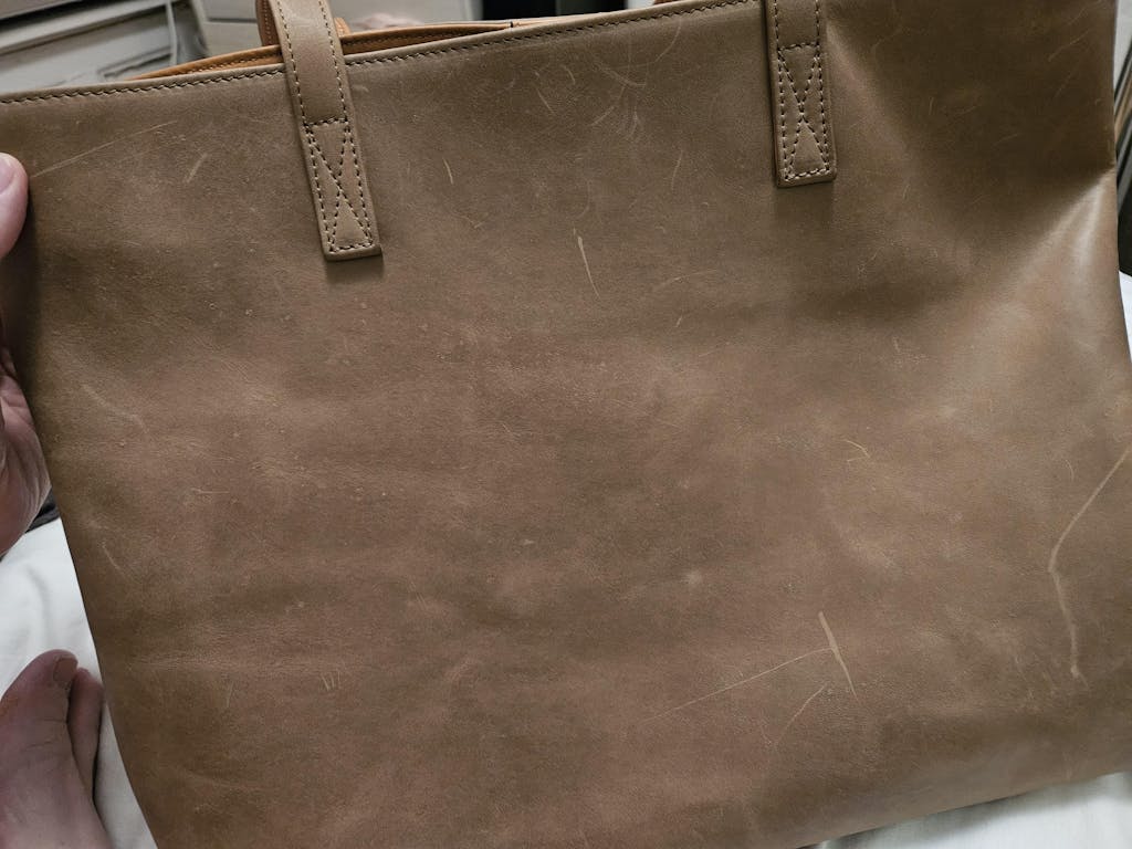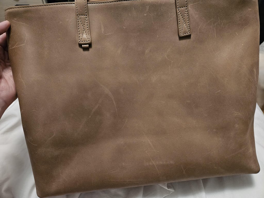 I had reservations about ordering this bag initially because it was not touted as full-grain leather. Even with discounts, I still found it a bit more expensive than some of the full-grain bags I primarily purchase from other brands. However, the Tan option kept calling out to me as I've been looking for a bag in this color for literally years. I'm not even sure if I would call it a tan as much as a taupe (my personal opinion). However, I follow this brand on YT and Instagram and have grown to trust them, so I thought I'd take the plunge. When I saw the narrow, rectangular box, I got a bit worried because I thought that meant the bag would be way smaller than I anticipated. Thankfully, I was wrong. It was rolled within a microfiber cloth but unfolded into the nice, huge bag I was hoping to receive. My bag was not at all creased from the way it was packaged, but it does have some gorgeous natural wrinkling in some areas from the hide used. At its widest point (the middle) it's about 18 inches, the height is just over 13 inches and the depth is just about five inches. This bag was made with love, there's absolutely no question about that. There wasn't a single thread out of place and the lining is a fabulous thick canvas sewn close to the bag so it's not loose and sloppy-looking. The leather itself has a nice matte finish though the texture remains smooth (it's not a brushed leather that changes appearance upon running your hand across it). I so appreciate the long malleable straps that stay on the shoulder, the super strong magnet closure, and the extra wristlet that came with the bag (it is very slim, incredibly soft, and measures 8.5"x5.25"). The bag also smells wonderful. What shocked me to high heaven is that it shipped two days after ordering and got to me all the way from Turkey three days after that! Long story short (too late :)) I have ZERO regrets and can honestly say it is well worth its price!